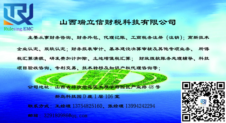 山西瑞立信財(cái)稅科技有限公司是以會(huì)計(jì)師事務(wù)所、稅務(wù)師事務(wù)所及知識(shí)產(chǎn)權(quán)代理公司等專(zhuān)業(yè)服務(wù)機(jī)構(gòu)作為依托背景,擁有多名注冊(cè)會(huì)計(jì)師、注冊(cè)稅務(wù)師、會(huì)計(jì)師、助理會(huì)計(jì)師等專(zhuān)業(yè)的財(cái)稅人員,擁有可靠而廣泛的社會(huì)資源,能保證客戶享受到安全、放心、可靠、完善的財(cái)稅服務(wù)。